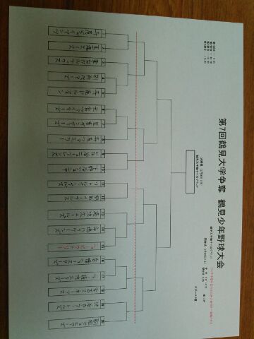ご苦労さまです。熱中症気味の平山です。(^_^)先ほど行われた【鶴大カップ】(Bチーム)の抽選結果は、添付ファイルのとおりとなりました。一回戦 vs 市場ハリケーンズ二回戦 vs 横浜ホェールズ(2つ勝つとベスト8入り)一回戦の日程はまだ未定ですが、早ければ開会式直後(9/22土曜)に試合が組まれるかもしれません。本大会にて【ベスト7】入りすると、来年春先に行われる学童大会(高円宮杯、全国共済大会など)に出場することができますので…しっかりと目標を定めて、日々の練習に取り組んでいきましょう?(^_^)By 平山