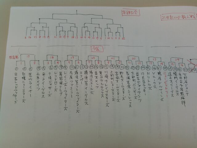 こんばんは?先ほど行われた【Bチーム】「21世紀カップ(新人戦)」の抽選結果は、添付写真のとおりでした。一回戦の相手「鴨居ドルフィンズ」(横須賀市)※横浜市の鴨居ではありません。選手人数構成は、ニュービクとほぼ同じ。敗者復活戦がある大会ではあるものの、きっちりと一回戦を突破できるよう…しっかりと準備していきましょう。なお、他大会スケジュールの都合上、8/25(日)PMが候補日に挙がっています。選手諸君は「心・技・体」のご準備を??(^_^)P.S.明日は、「鶴大カップ」(Bチーム)の抽選会が行われます。この大会にて決勝進出した2チームは、来春に行われる「高円宮杯横浜市大会」に出場することとなり…それにベスト6入りすれば「高円宮杯県大会」に…そして、この県大会に優勝したチームが「全国大会」に出場することになります。つまり、少年野球、唯一の全国大会に繋がっている大会の「鶴見区予選」抽選会が明晩あるということだから…夏休み気分は「今週末まで」として、来週からは「野球少年モード」にスイッチオンしてください?少なくても、ニュービクのチームテーマでうる【俺がやる】を絶対忘れないように?悔いを残さない戦いを是非?By 平山