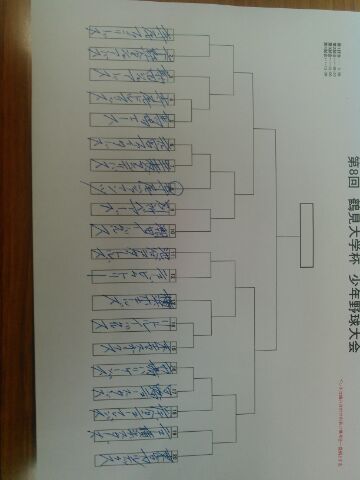 [All:861] 鶴大カップ抽選結果 2019/08/112019/08/11 こんばんは?先ほど行われた【Bチーム】「鶴大カップ」の抽選結果は、添付写真のとおりでした。ニュービクは二回戦?のスタートで、初戦の相手は【池谷戸タートルズ】…これに勝てば「ベスト8」入り…何となく、最高の山割りとなったような気がする。(^_^)v決勝進出して、来春の「高円宮杯」に出場できるよう、気合いを入れてこの大会に臨んでいきましょう?成せば成る?(^_^)By 平山